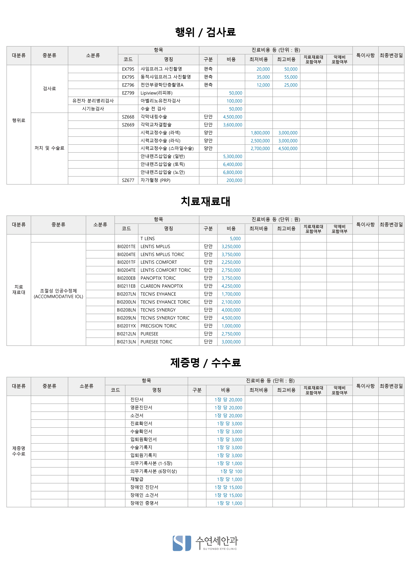 [수연세안과 비급여 수술/검사 및 제증명 비용 안내]