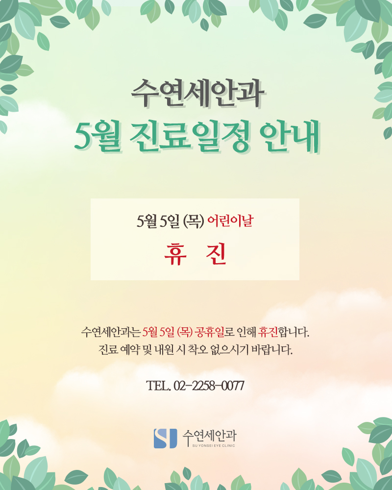 | 174 | [수연세안과] 2023년 5월 진료안내 | 수연세안과 | 2023.04.07 | 809 | |