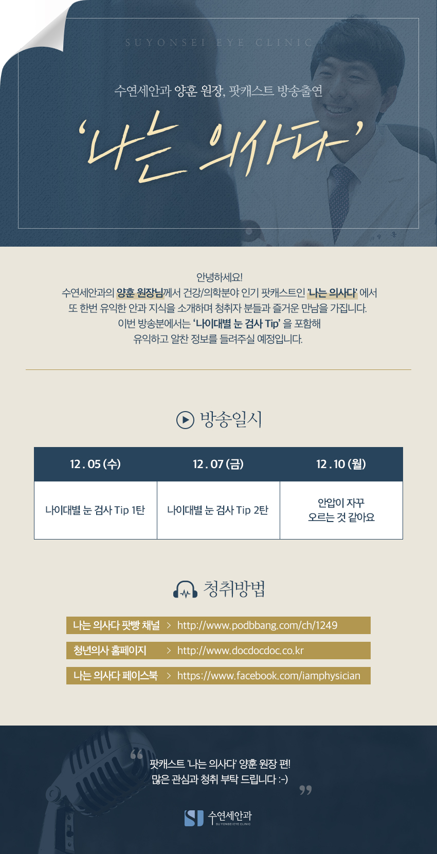 [수연세안과] 양훈 원장, 팟캐스트 '나는 의사다' 출연 - 나이대별 눈검사 Tip 편