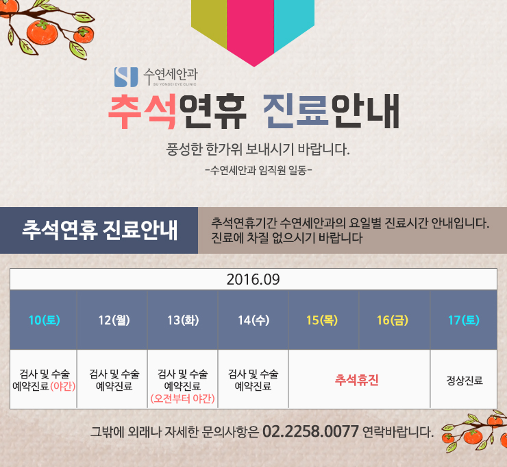 [수연세안과 진료안내] 2016 추석연휴 진료안내